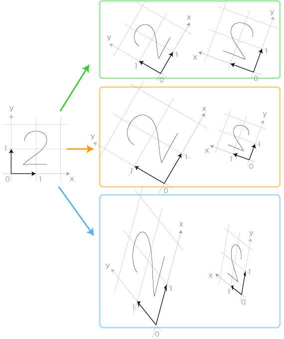 上の「同形」3タイプには,つぎの座標枠変換3タイプが対応する: