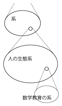 自己言及的な系の「自己言及的」の内容は,「要素の更新」である。 「要素の更新」には,要素の再布置と要素の新陳代謝がある。 数学教育の系は,また,上位の自己言及的系の要素である。 この上位の系は,「人の生態系」のイメージにあたるものである。 数学教育の系は,生態系の要素として,新陳代謝する。 人の生態系もまた,上位の自己言及的系の要素である。 人の生態系は,これの上位の系の要素として,新陳代謝する。