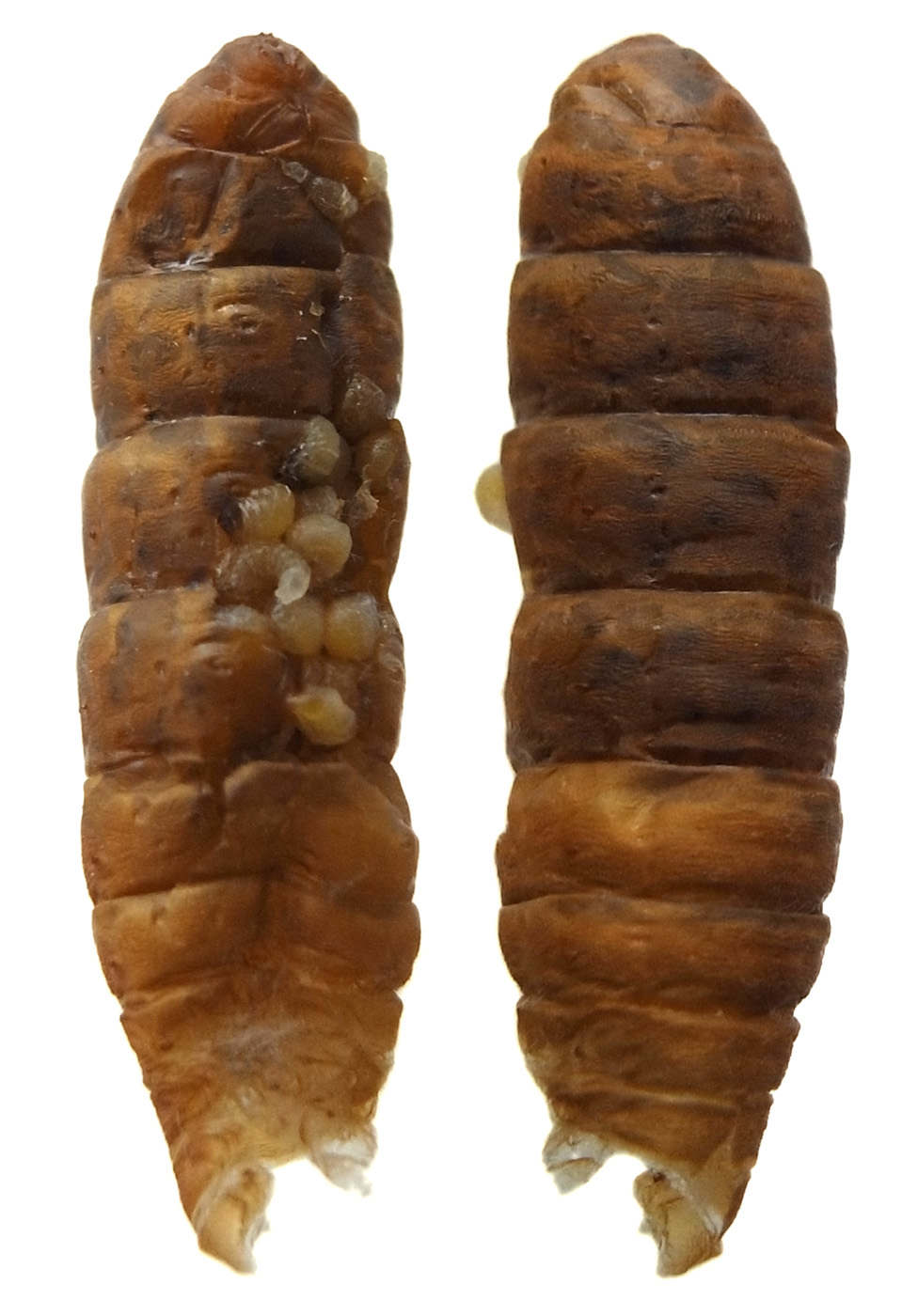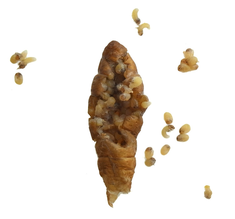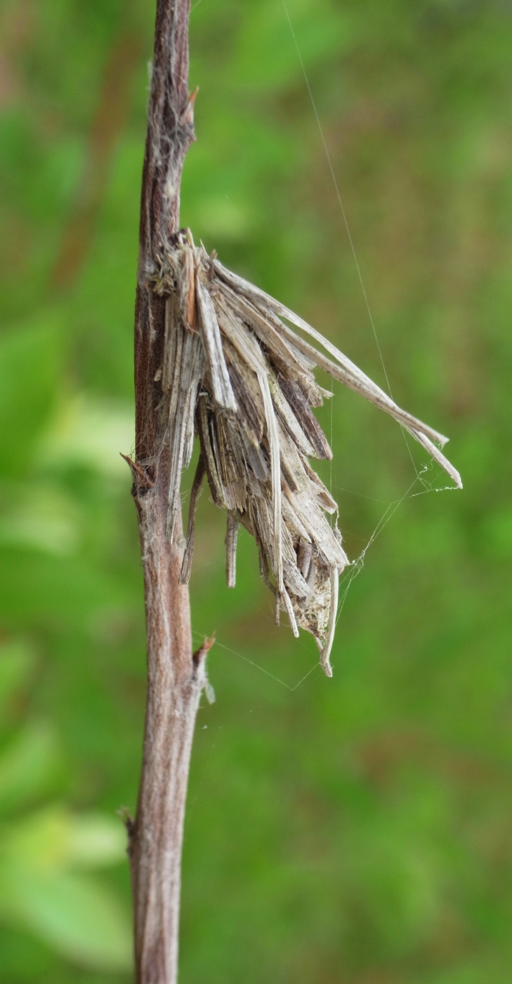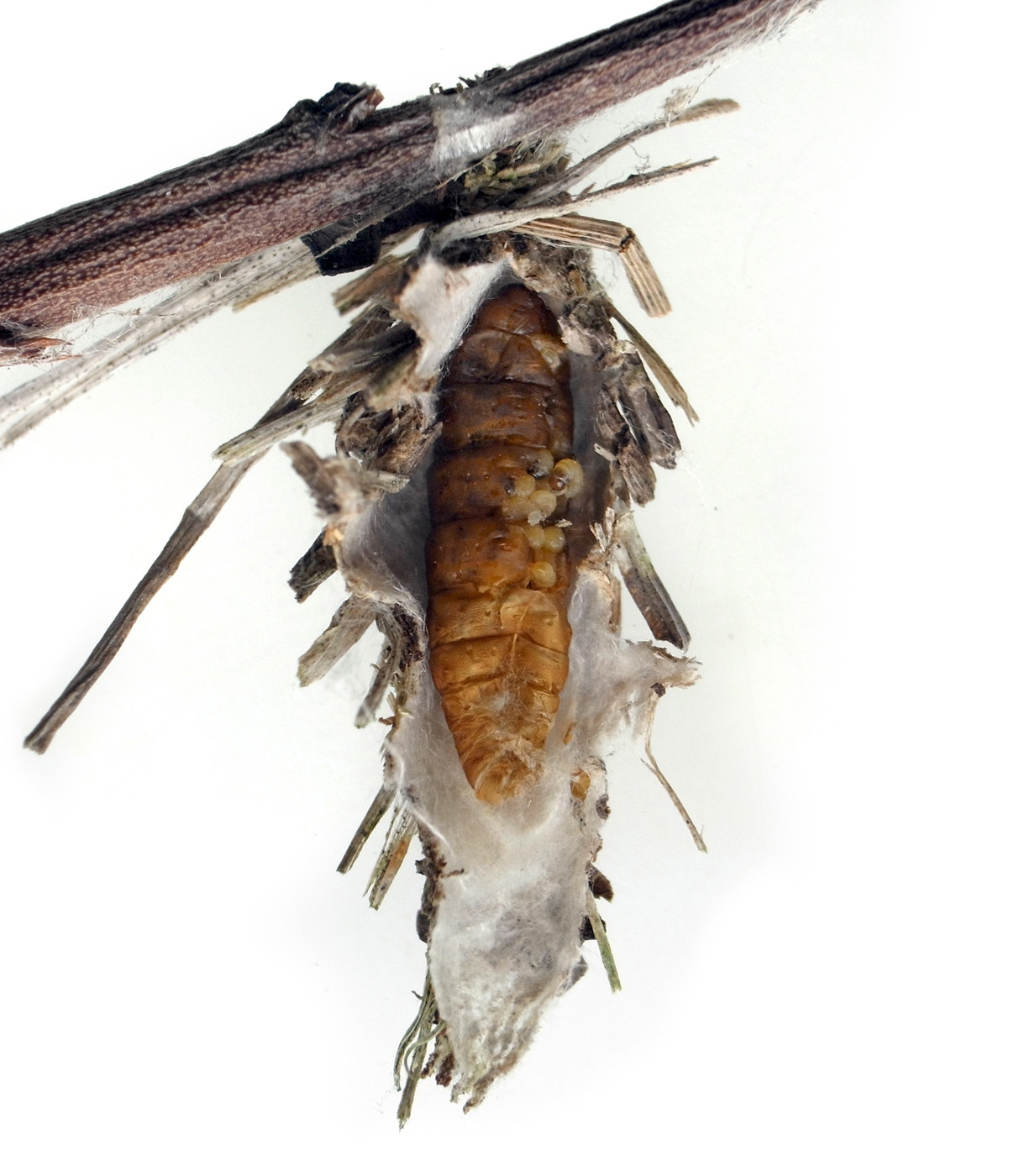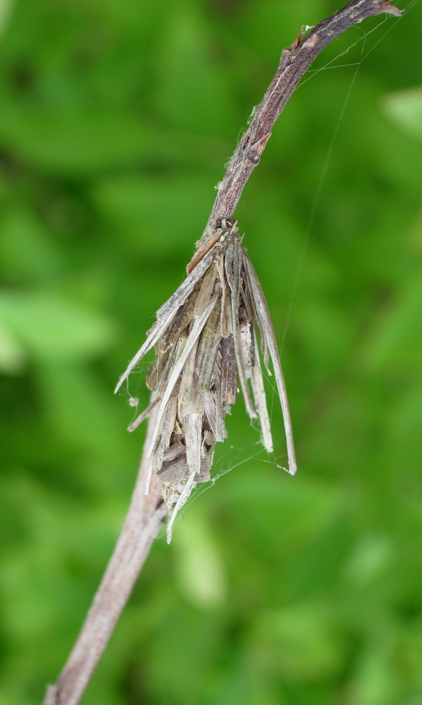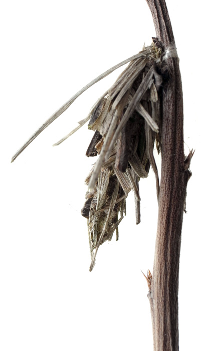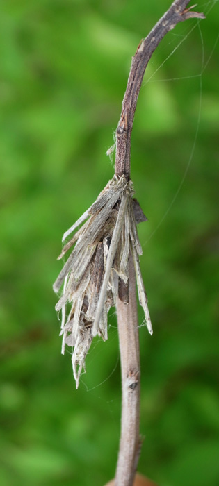 ミノムシは幼虫で越冬し,春に蛹になる。 ♀では,蛹の状態で成虫になる。 腹部は卵 (無精卵) でいっぱいになっている。 この状態で,蓑にやってきた♂と交尾する。 交尾後,蛹の殻の中で産卵する。 2〜3週間後に,幼虫が孵化してくる。 その間に♀は死ぬ──小さく干涸らび,最後は蓑から下に落ちる。 孵化した幼虫は,蓑の外に出て糸を長く延ばし垂れ下がる──風に運ばれて枝葉へ到ろうとする体勢。 |