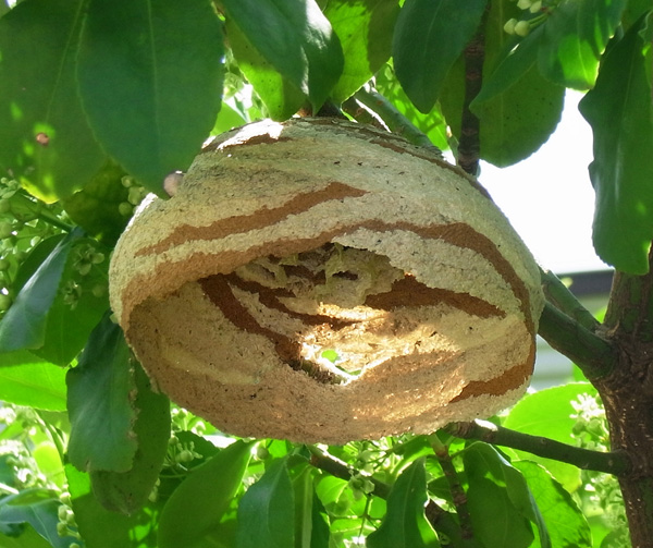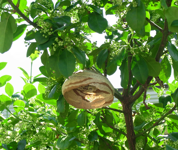 この巣の女王蜂らしいスズメバチが,巣から少し離れて飛んでいる。