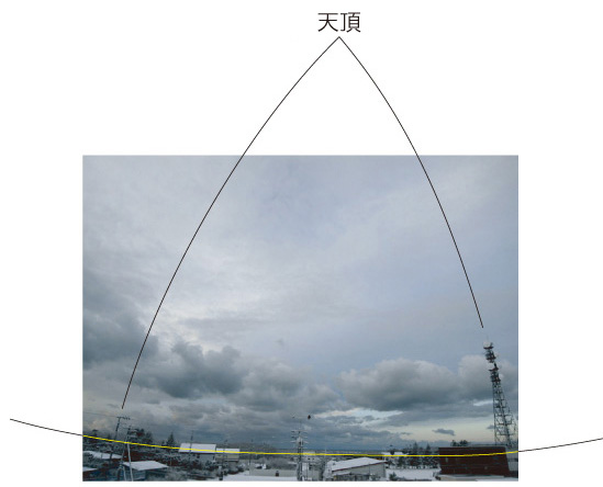 地面に垂直な線は,天頂 (半天球の頂点) を向いている。