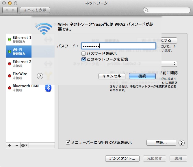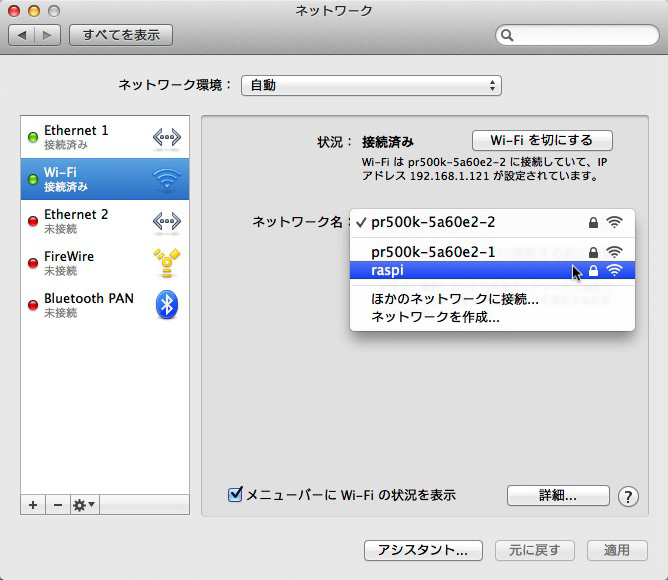 - 「ネットワーク名」メニューの中に「raspi」見える。