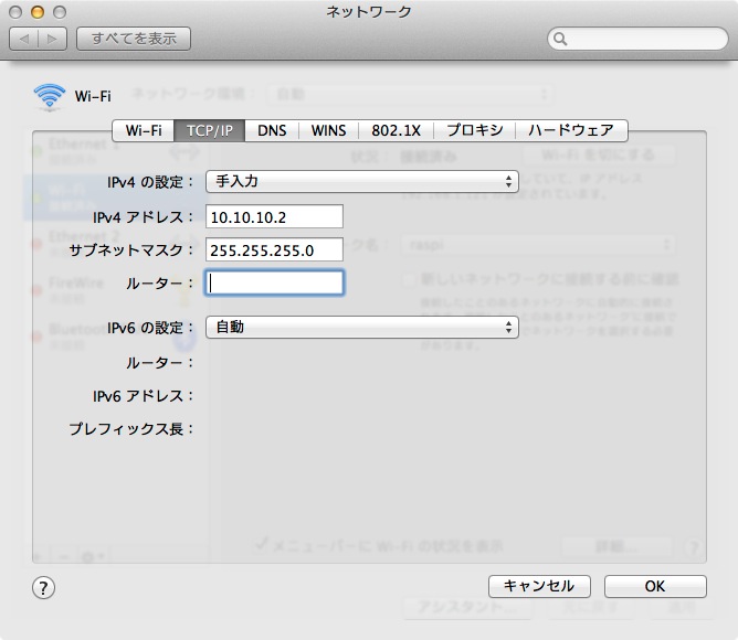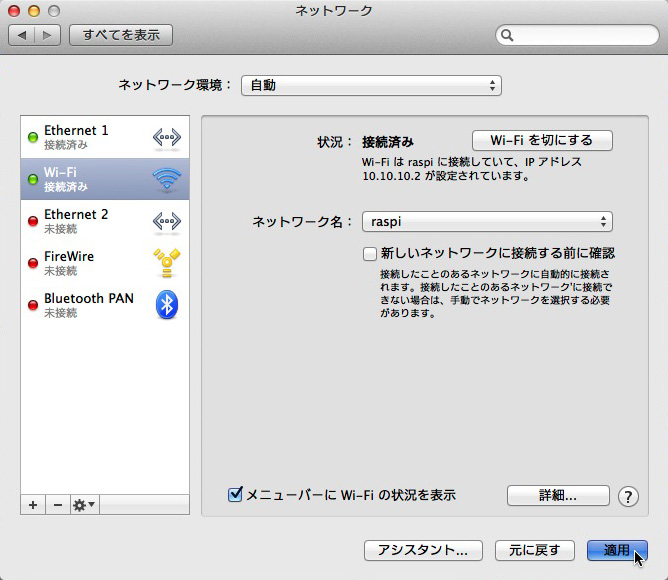 - これで,WiFi による PC (IP アドレス 10.10.10.2) と Raspberry Pi (IP アドレス 10.10.10.1) が可能になる。