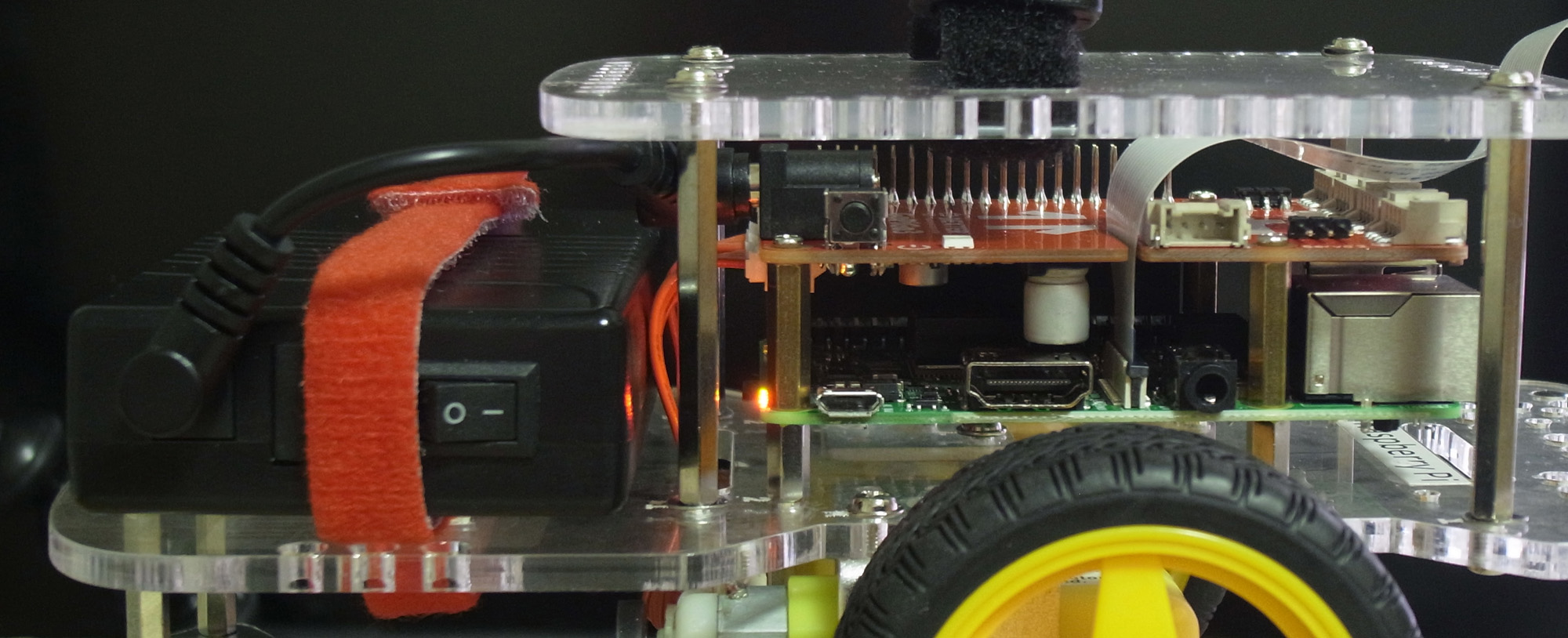 上の赤のボードが GoPiGo,下の緑のボードが RaspberryPi