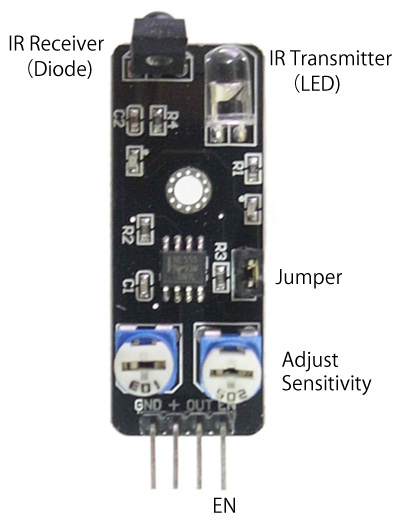 The emitting LED sends infrared light pulses at a certain frequency. When the light hits an obstacle is reflected back to the receiver LED. KY-032 Obstacle-detect module より: