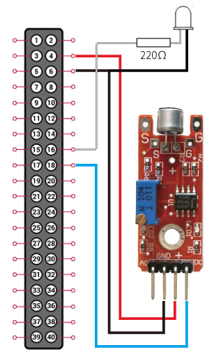 #!/usr/bin/python import RPi.GPIO as GPIO SoundPin = 18 LedPin = 16 def setup(): # Set the GPIO pins as numbering GPIO.setmode(GPIO.BOARD) # Set the SoundPin's mode is input, and (Not detected→) ON→ LOW GPIO.setup(SoundPin, GPIO.IN, pull_up_down=GPIO.PUD_UP) # Set the LedPin's mode is output GPIO.setup(LedPin,GPIO.OUT) # Set the LedPin low GPIO.output(LedPin, GPIO.LOW) def destroy(): # Release resource GPIO.cleanup() def loop(): while True: if GPIO.input(SoundPin) == GPIO.HIGH: GPIO.output(LedPin,GPIO.HIGH) else: GPIO.output(LedPin,GPIO.LOW) # The Program will start from here if __name__ == '__main__': setup() try: loop() # When control c is pressed child program destroy() will be executed. except KeyboardInterrupt: destroy()
