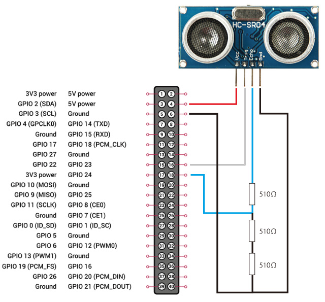 Raspberry Pi の GPIOピン入力は 3.3V なので,5V を 3.3V に分圧する必要がある。
