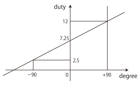 180° 回転のサーボに対し,degree −90° 〜 +90° を duty 2.5 〜 12 と線型に対応づける: