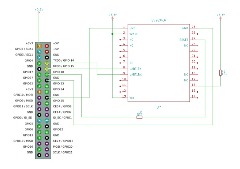 マイコンのプログラムからES920LRをリセットするために、ESP8266もRaspberry Pi3もGPIOピンをES920LRのリセットピンに接続しました。