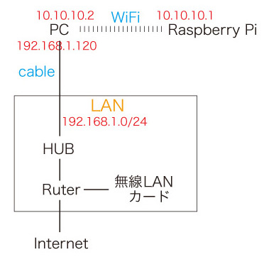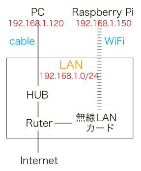 Raspberry Pi の WiFi は,ネットワークの中につぎのようにおさまるものである: