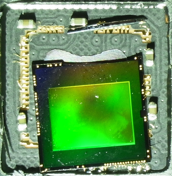 レンズ部を取り除いて,イメージセンサー (中央の長方形) を現したところ: