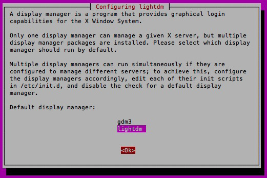 インストール途中で,display manager の選択 (gdm3 or lightdm) を求める画面が現れる