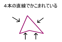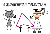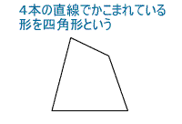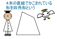 「どうかな?この形も4本の直線で囲まれているね?どん な形でも4本の直線で囲まれてれば、それは四角形なんだ。」 |