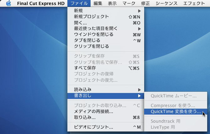 - Final Cut Express HD のバーメニューから,つぎのように「QuickTime 変換を使う...」を選択: