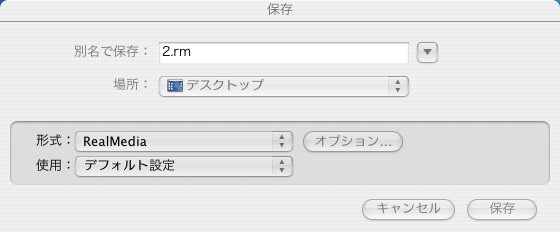 - つぎのウィンドウが開くので,保存ファイルの名前を入力,場所を設定,そして形式を「RealMedia」に設定する。