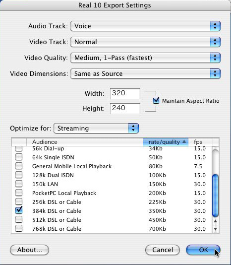 「RealVideo 10 形式のファイルはバージョン G2 から 8 の RealServer または Helix Server でストリームできる」となっているので,この形式でストリーミング・ムービーを作成してよい。