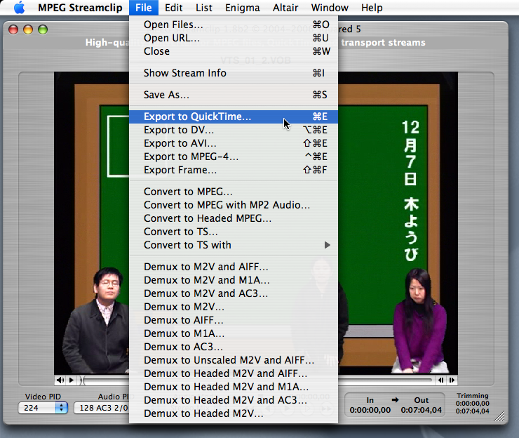 - MPEG Streamclip のバーメニューから,つぎのように「Export to QuickTime...」を選択: