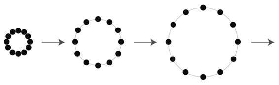 しかし,「宇宙の膨張」は,どの観察者も膨張の中心であり,遠ざかる速さが観察者からの距離に比例するというものである。よって,つぎが「宇宙の膨張」の絵である: