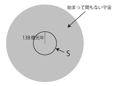 自分を中心とする半径138億光年の球面をSとすると,138億年前──即ち,宇宙が始まって間もない時──にS上で発した光は,ちょうどいま自分に届いている。