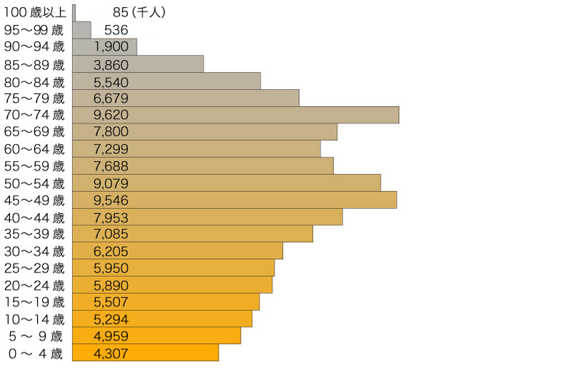 上の2つから年齢別死亡率 (何人中1人が死亡) を計算すると: