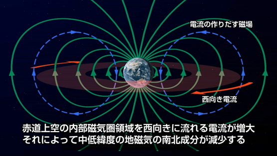 磁気嵐の基本的な表れは, 磁気圏内に環状電流が発達しその西向き電流が地球上で地磁気水平成分を減らすことである。