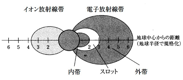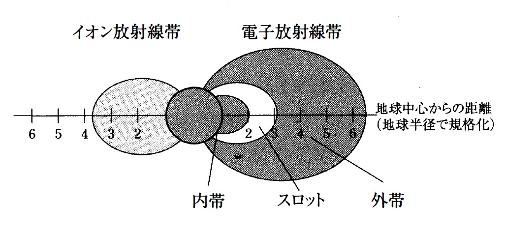| プロトン・イオン放射線帯は単一のベルト構造であるのに対して,電子放射線帝は,フラックスが大きい内帯,外帯とその間にフラックスの少ないス