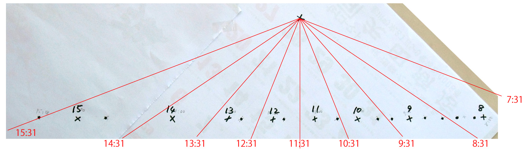 影の長さが最短になる南中は,記録図面では日本標準時で 11:20 頃。
