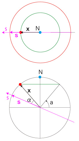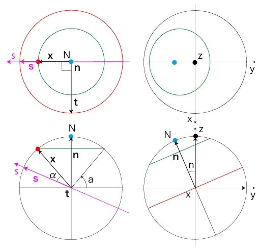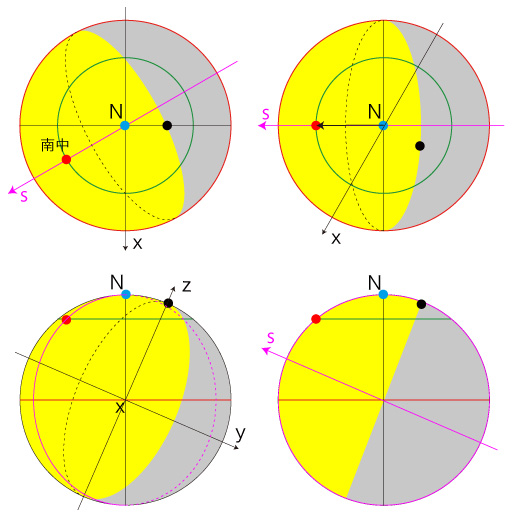 公転角がτのときの,緯度aの南中の座標 (x, y, z) は? 簡単のため \[ n_s = sin(n), \ \ n_c = cos(n) \\ a_s = sin(a), \ \ a_c = cos(a) \\ \tau_s = sin(\tau), \ \ \tau_c = cos(\tau) \] とおく。 さらにこの簡略記法 \[ \theta_s = sin(\theta) \\ \theta_c = cos(\theta) \] を,一般の \( \theta \) に対しても用いるとする。 南中の位置: