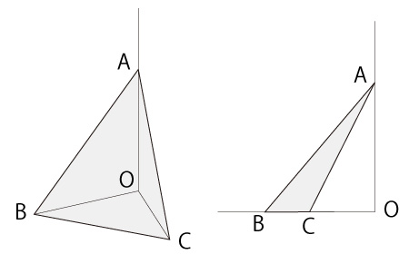 地平面に垂直に立てた軸に,三角形の板 (頂点をA, B, C とする) を図のようにもたせかける: