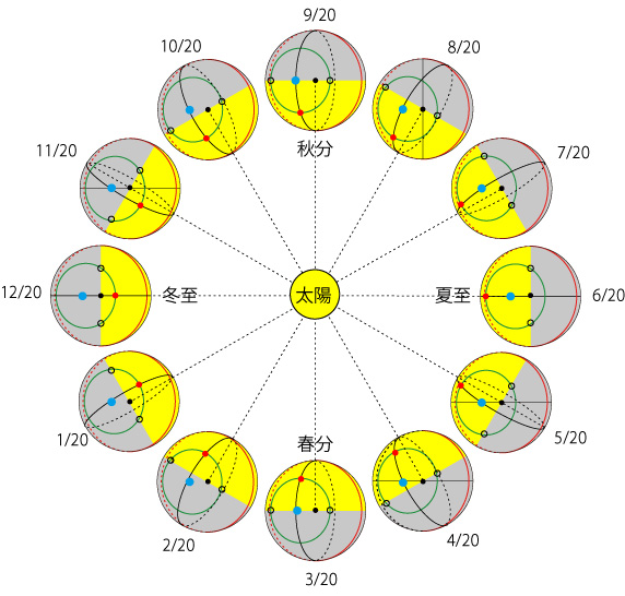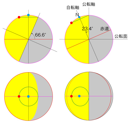 北半球の高緯度地帯では,夏は一日中太陽が沈まない「白夜」になり,冬はその逆 (一日中太陽が昇らない) になる。