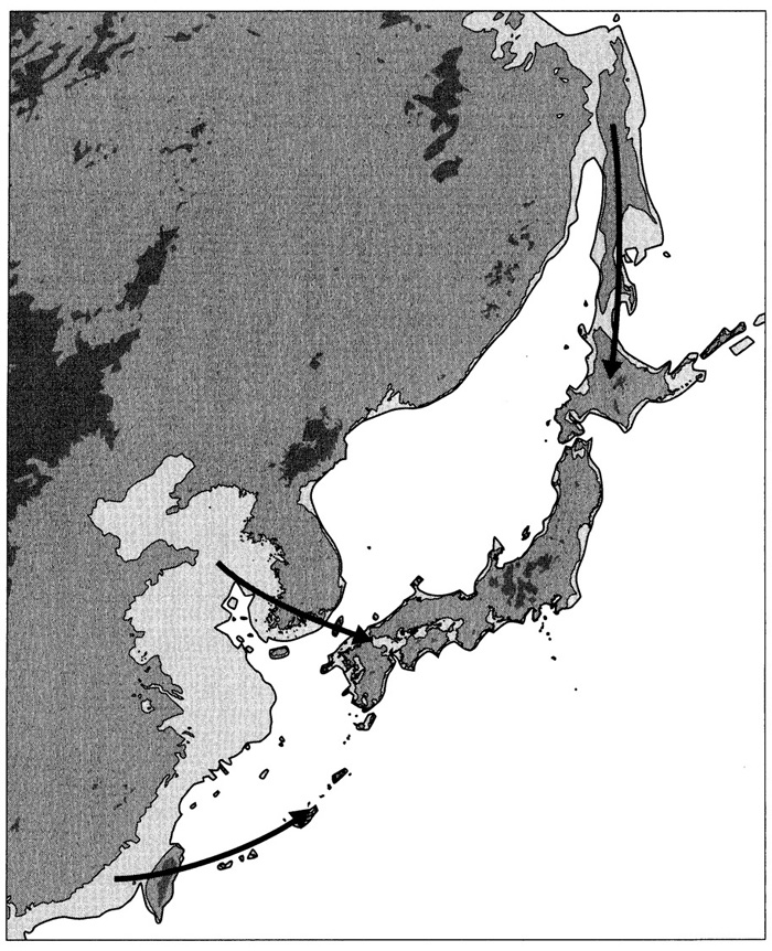 「3万8000年前頃の日本列島への3つの可能な渡来ルート」