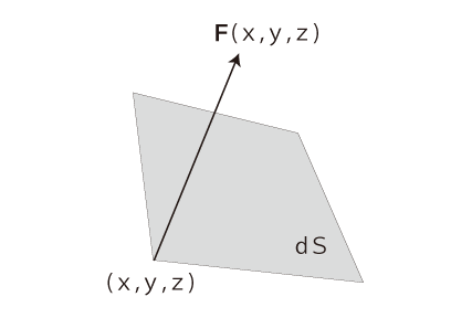力ベクトル場 \( \vec{F} (\vec{x}) \) の中の微小面積 \( dS \) を考える: