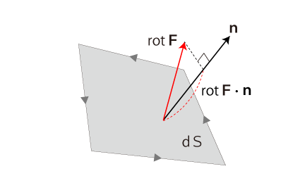そして,つぎがこれの用い方になる: \[ \int_S rot \, \vec{F} \cdot \vec{n} \, dS \]