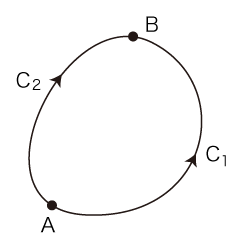 に対し,これをつぎのように場所Bで区切り,2つの経路 \( C_1, \,C_2 \) を見立てる: