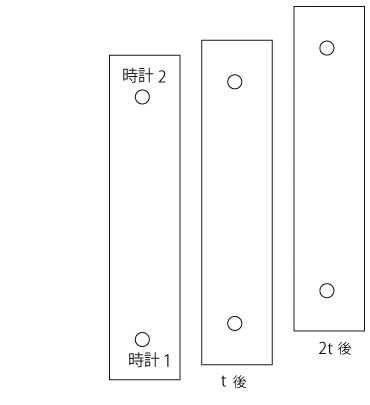 時計2の位置から時計1を見ると,だんだんと遅れていくように見える: