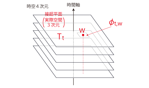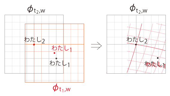 よって, わたしの<いま・ここ> \( (t’, w)\) の \(w\) は,固定される。 「一般相対性」とは,《わたしに対し周りが動く》ということである。 地図溯行の作業は,<地図を接ぐ>である。 わたしの<いま・ここ>の地図 \(\phi_{t',w}\, ( t' < t ) \) を順番に接いでいく。 地図 \(\phi_{t_1,w}\) に地図 \(\phi_{t_2,w}\) を接ぐとは,\(\phi_{t_2,w}\) に \(\phi_{t_1,w}\) を読み込むということである。