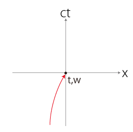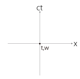 こうして得られる<いま・ここ>の系列は,ミンコフスキー空間の \(t\,xyz\) 座標に記すのが便利である。 即ち,一つの<いま・ここ>を原点に定め,これと相対的に他の<いま・ここ>をプロットする。 ただしこの座標は4次元である。 \(y,\,z\) 座標を使わなくて済む場面設定が都合よくできれば,つぎの \(t\,x\) 座標──即ち,\(t\) 軸と\(x\) 軸が張る座標面──で足りることになる。