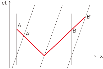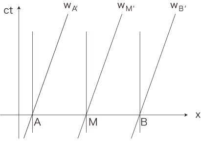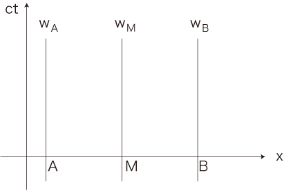 tx座標を導入し,A, M, B の世界線 \( w_A ,\, w_M ,\, w_B \) を書く。