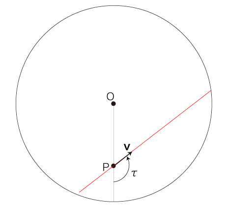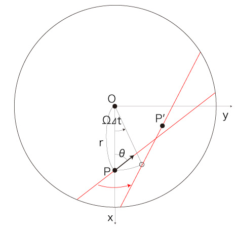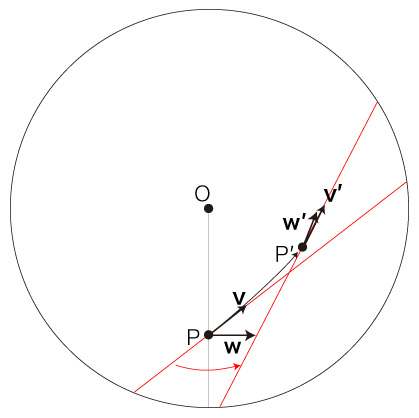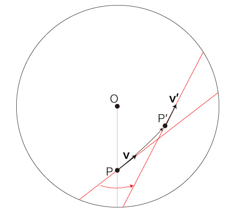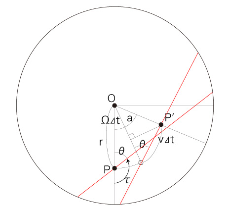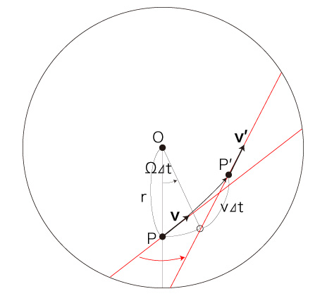 自転する円板状の速さ \( v = | \bf{v} | \) の移動は,\( P \) での速度 \( \bf{v} \) の向きを変えることになる。 この変化が,「加速度」に表現される。 また移動は,位置の変化により,慣性力加速度を被ることになる。 即ち,円板の自転による回転速度が<回転の中心からの距離>によって異なることで,移動は回転速度の変化を慣性力加速度として被ることになる。 これを踏まえたところで,つぎの設定をする: 時間 \( \Delta t \) [時間単位] で,移動がつぎの点 \( P' \) に到ったとする: