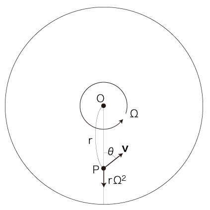 このとき, \[ {\bf{v}} = ( v_x,\ v_y ) \\ {\bf{w}} = ( w_x,\ w_y ) \\ {\bf{v'}} = ( v'_x,\ v'_y ) \\ {\bf{w'}} = ( w'_x,\ w'_y ) \] は: \[ v_x = - v\ cos( \theta ) \\ v_y = v\ sin( \theta ) \\ \ \\ \ \\ w_x = 0 \\ w_y = r\ \Omega \\ \ \\ \ \\ v'_x = - v\ ( cos(\theta) cos(\Omega \Delta t) + sin(\theta) sin(\Omega \Delta t) ) \\ v'_y = v\ ( sin(\theta) cos(\Omega \Delta t) - cos(\theta) sin(\Omega \Delta t) ) \\ \ \\ \ \\ w'_x = - \overline{ OP'}\ \Omega\ ( sin(a)\ cos(\Omega \Delta t) + cos(a)\ sin(\Omega \Delta t) ) \\ w'_y = \overline{ OP'}\ \Omega\ ( cos(a)\ cos(\Omega \Delta t) - sin(a)\ sin(\Omega \Delta t) ) \\ \] \( {\bf v'} - {\bf v} \) は, \[ \frac{ {\bf v'} - {\bf v} }{ \Delta t } \longrightarrow ( - v\ \Omega\ sin(\theta),\ - v\ \Omega\ cos(\theta) ) \ \ \ ( \Delta t \rightarrow 0 ) \] \( {\bf w'} - {\bf w} \) は, \[ \frac{ {\bf w'} - {\bf w} }{ \Delta t } \longrightarrow ( - r \Omega^2 - v \Omega sin(\theta),\ - v \Omega\ cos(\theta) ) \ \ \ ( \Delta t \rightarrow 0 ) \] よって,移動 \( ( P, {\bf{v}} ) \) にかかる加速度は, \[ \begin{align} & \ ( - v \Omega\ sin(\theta),\ - v \Omega\ cos(\theta) ) \\ & \ - ( - r \Omega^2 - v \Omega sin(\theta),\ - v \Omega\ cos(\theta) ) \\ \ \\ = & \ ( r \Omega^2,\ 0 ) \end{align} \]
