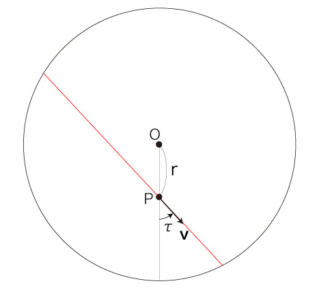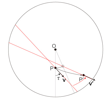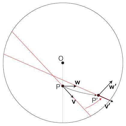 自転する円板状の速さ \( v = | \bf{v} | \) の移動は,\( P \) での速度 \( \bf{v} \) の向きを変えることになる。