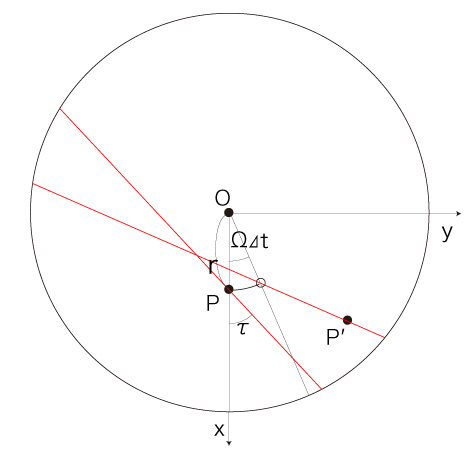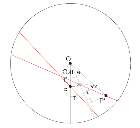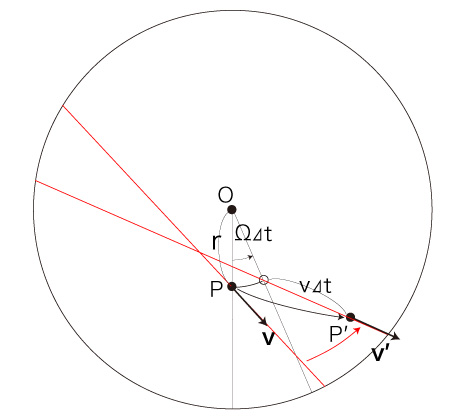 このとき, \[ {\bf{v}} = ( v_x,\ v_y ) \\ {\bf{w}} = ( w_x,\ w_y ) \\ {\bf{v'}} = ( v'_x,\ v'_y ) \\ {\bf{w'}} = ( w'_x,\ w'_y ) \] は: \[ v_x = v\ cos( \tau )\\ v_y = v\ sin( \tau )\\ \ \\ \ \\ w_x = 0 \\ w_y = r\ \Omega \\ \ \\ \ \\ v'_x = v\ ( cos(\tau) cos(\Omega \Delta t) - sin(\tau) sin(\Omega \Delta t) ) \\ v'_y = v\ ( sin(\tau) cos(\Omega \Delta t) + cos(\tau) sin(\Omega \Delta t) ) \\ \ \\ \ \\ w'_x = - \overline{ OP'}\ \Omega\ ( sin(a)\ cos(\Omega \Delta t) + cos(a)\ sin(\Omega \Delta t) \\ w'_y = \overline{ OP'}\ \Omega\ ( cos(a)\ cos(\Omega \Delta t) - sin(a)\ sin(\Omega \Delta t) ) \\ \]