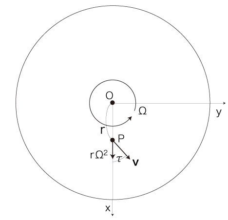 よって,移動 \( ( P, {\bf{v}} ) \) にかかる加速度は, \[ \begin{align} & \ ( - v \Omega\ sin(\tau),\ v \Omega\ cos(\tau) ) \\ & \ - ( - r \Omega^2 - v \Omega sin(\tau),\ v \Omega\ cos(\tau) ) \\ \ \\ = & \ ( r \Omega^2,\ 0 ) \end{align} \]