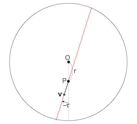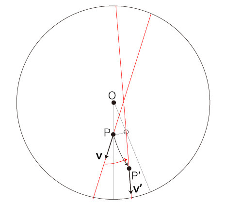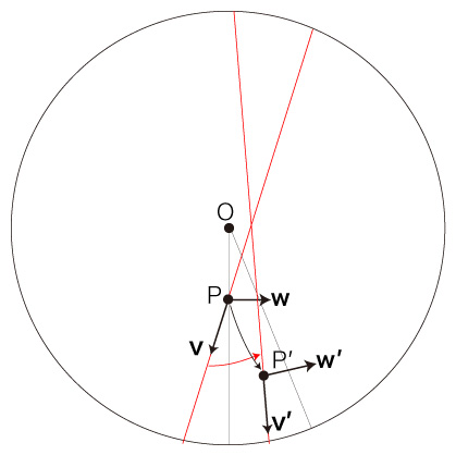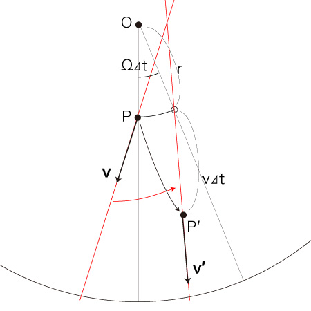 自転する円板状の速さ \( v = | \bf{v} | \) の移動は,\( P \) での速度 \( \bf{v} \) の向きを変えることになる。