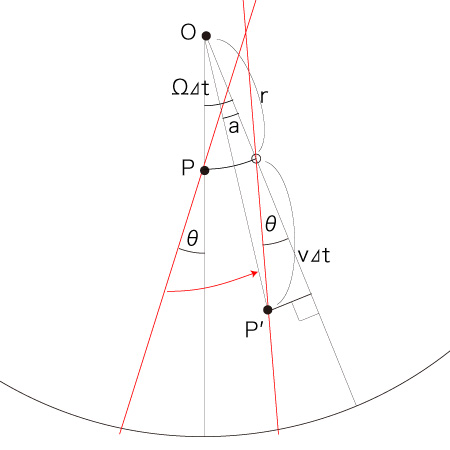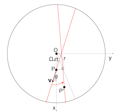 このとき, \[ {\bf{v}} = ( v_x,\ v_y ) \\ {\bf{w}} = ( w_x,\ w_y ) \\ {\bf{v'}} = ( v'_x,\ v'_y ) \\ {\bf{w'}} = ( w'_x,\ w'_y ) \] は: \[ v_x = v\ cos( \theta )\\ v_y = - v\ sin( \theta )\\ \ \\ \ \\ w_x = 0 \\ w_y = r\ \Omega \\ \ \\ \ \\ v'_x = v\ ( cos( \theta)\ cos(\Omega \Delta t) + sin( \theta)\ sin(\Omega \Delta t) ) \\ v'_y = - v\ ( sin( \theta)\ cos(\Omega \Delta t) - cos( \theta)\ sin(\Omega \Delta t) ) \\ \ \\ \ \\ w'_x = \overline{ OP'}\ \Omega\ ( sin(a)\ cos(\Omega \Delta t) - cos(a)\ sin(\Omega \Delta t) ) \\ w'_y = \overline{ OP'}\ \Omega\ ( cos(a)\ cos(\Omega \Delta t) + sin(a)\ sin(\Omega \Delta t) ) \\ \]