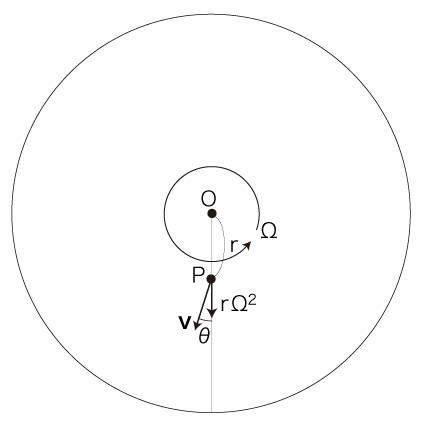 よって,移動 \( ( P, {\bf{v}} ) \) にかかる加速度は, \[ \begin{align} & \ ( v\ \Omega\ sin(\theta),\ - v\ \Omega\ cos(\theta) ) \\ & \ - ( v\ \Omega\ sin(\theta) - r\ \Omega^2,\ - v\ \Omega\ cos(\theta) ) \\ \ \\ = & \ ( r \Omega^2,\ 0 ) \end{align} \]