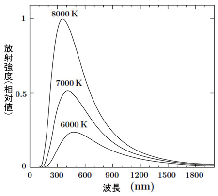 さて,その実際的表現は,「高炉の温度は 2000°C」のようなものになる。 「2000°C」? これは何なのか? それは,測定値である。 「温度の実際的表現」の導入は,「温度の測定」が併せて導入されているわけである。 そこで,「温度の測定」とは何か?となる。 物体の温度は,<粒子間での光子の受け渡し──これの平衡状態>であった。 (温度が違うとは,光子受け渡しの平衡状態が違うということ!) ここで外に飛び出してくる光子を捉えて測る。 「光子」は量子力学の物言いであって,古典力学では電磁波である。 外に出て来た電磁波に対し,それの波長分布を計測する。 そして,計測された波長分布に「プランクの放射則」を適用する。 これが,このときの「温度を計算する」であり,「温度の測定」である。 天文学辞典「プランク分布」から引用: