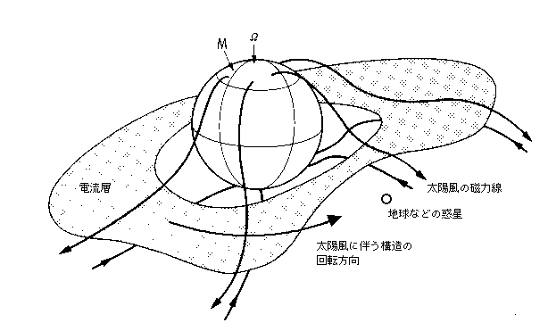 - 太陽の磁場の磁極が北向きから南向きに変わる面に,電流層ができる (「太陽圏電流シート」) 。