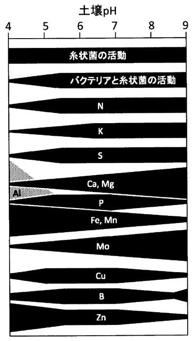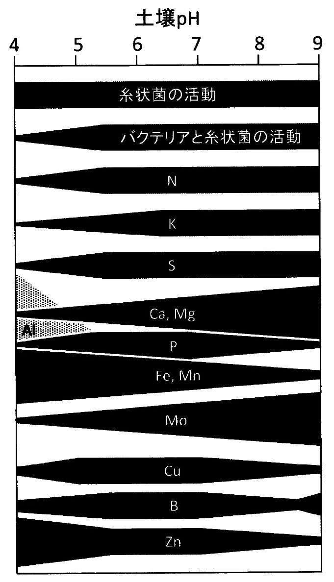 総じて,植物が根を通して土壌から養分を吸収する場面では,多くの場合,弱酸性領域の土壌が最も好適である。