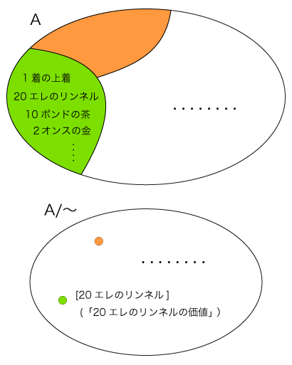 「価値」の構成では,集合Aとして人が交換し合う商品の集合を考え,「互いに交換される」を同値関係「〜」と見なした。 「〜」は,Aを交換可能な商品どうしの類に分けることになる。